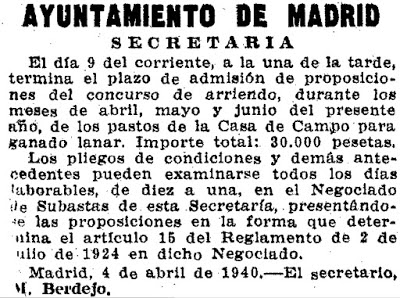 Durante los cinco años republicanos las actividades ganaderas se mantuvieron, pero con la Guerra Civil de 1936, como es de suponer no solo desapareció el ganado, sino también los edificios e instalaciones que lo albergaban. Cuando en 1939 termina la guerra la Casa de Campo está llena de peligros; munición sin explotar, edificios medio arruinados y la tierra horadada por las trincheras. En esta situación y cuando estaba prohibido el acceso de las personas al recinto, el 4 de abril de 1940 sale a concurso de arriendo los pastos de la Casa de Campo para los meses de abril, mayo y junio para ganado lanar. Este concurso se repetirá durante los años posteriores, a veces se mantendrán los contratos del año anterior por falta de demanda.