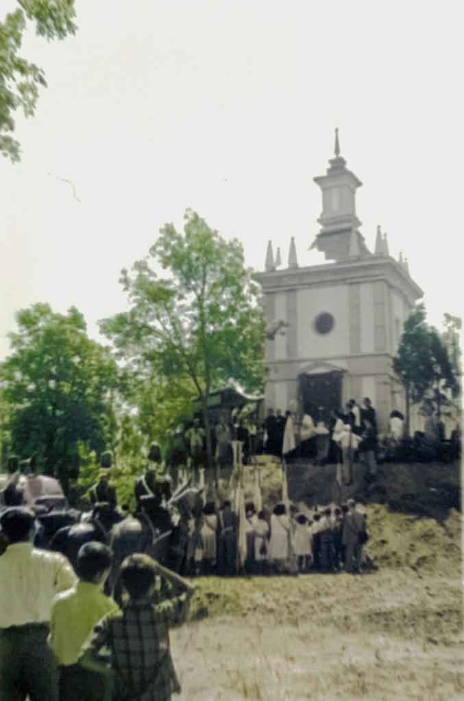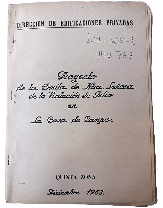 “Ya desde el año 1949 se celebraba una romería en la Casa de Campo, y precisamente por vecinos del distrito de Carabanchel. No es difícil relacionar esa romería con la iniciativa de levantar una ermita, cuya inauguración se efectuaría el 18 de julio de 1954. El padre Román, de la orden franciscana, coordinaría la parte litúrgica. El Teniente de Alcalde Tomás Garrido, dio lectura al acta de entrega de la ermita, que hace el Ayuntamiento al Obispado, y que quedará adscrita a la parroquia de Santa Cristina”.