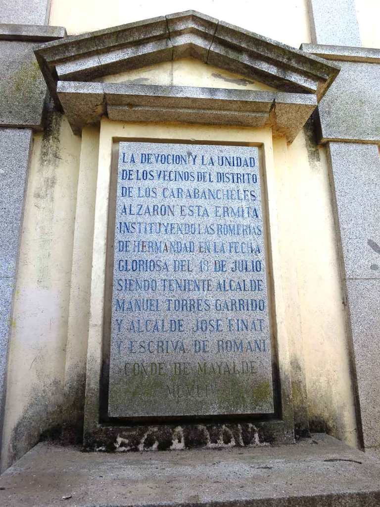 «La devoción y la unidad de los vecinos del distrito de los Carabancheles alzaron esta ermita, instituyendo las Romerías de Hermandad en la gloriosa fecha del 18 de julio, siendo Teniente de Alcalde Manuel Torres Garrido y Alcalde José Final Escrivá de Romaní, Conde de Mayalde. MCMLIV».