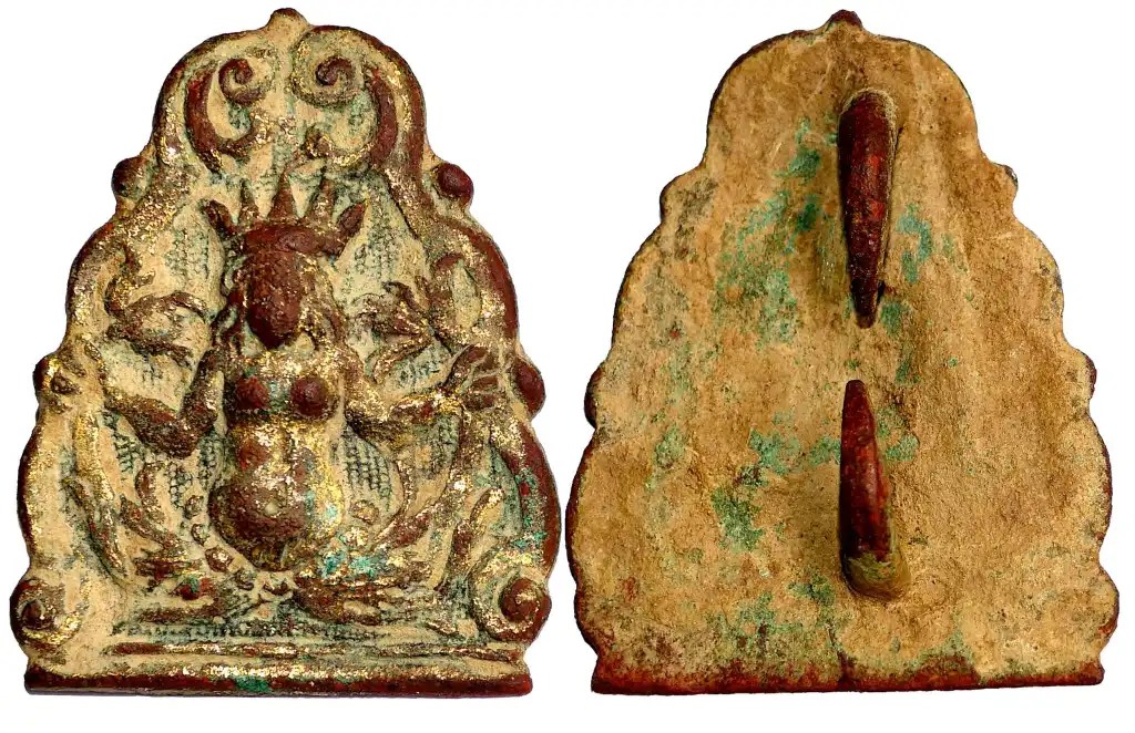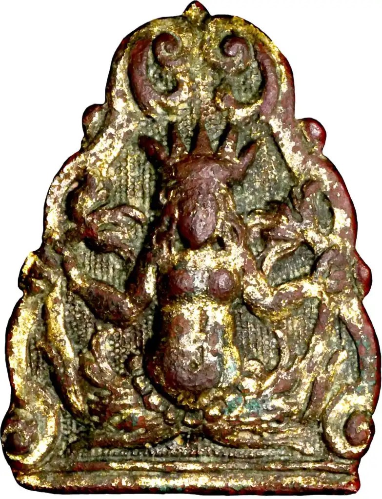 Hablábamos de un adorno de cobre —a partir de ahora lo llamaremos así—, antaño bañado en oro, triangular, acampanado, de 4,6 cm de alto por 3,6 cm en su parte más ancha, bordeado al estilo corintio con flores de acanto.