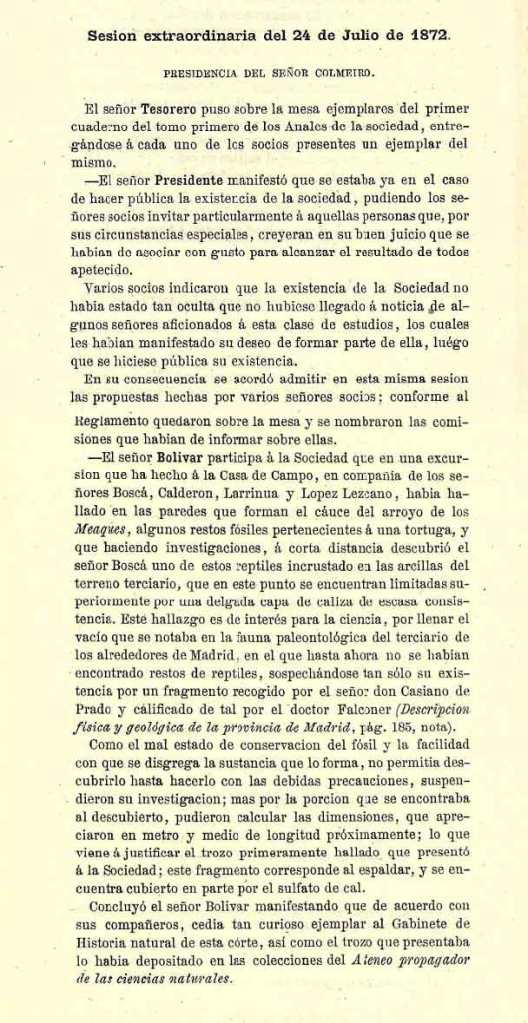 En el terreno terciario de la Casa de Campo, y en el arroyo llamado de los Meaques, (junto al Lago) acaba de descubrirse una tortuga fósil de dimensiones colosales, y como no se conoce en ningún museo de Europa. El descubrimiento se debe a don Ignacio Bolívar, joven naturalista é individuo de la sociedad Española de Historia natural, que ha inaugurado con tan fausto suceso sus tareas. Cuando este curioso fósil ofrezca las condiciones apetecidas, se dará á conocer de la manera científica que merece.