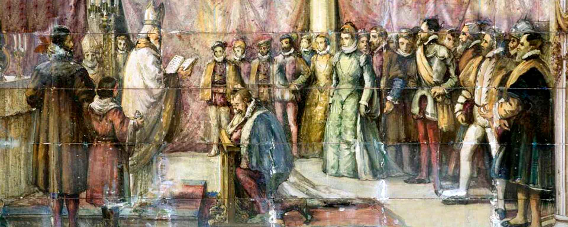 Y para mi incomodidad, me aguardaban enviados por Felipe, el maestro de ceremonias con 350 mulas de carga, literas y hacaneas; y no lejos, el Duque del Infantado, y el cardenal don Fernando de Mendoza, obispo de Burgos, con sendos lujosísimos séquitos, mostrando aquél a su lado treinta señores de las más apergaminadas casas del Reino, más cuarenta pajes vestidos de tela de oro, y rodeado el Cardenal por muchedumbre de prelados, dignidades y monjes, reuniéndose entre ambas comitivas un tropel de 4.000 caballos.