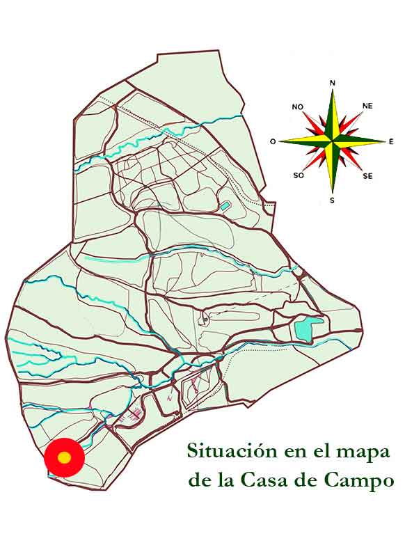 VER SITUACIÓN EN Google Maps UTM 30T 434413.60 m E – 4472705.96 m N. En la Glorieta del Zarzón, junto a la Portillera del Batán y en la margen izquierda del Arroyo de los Meaques en el Cuartel de Rodajos.