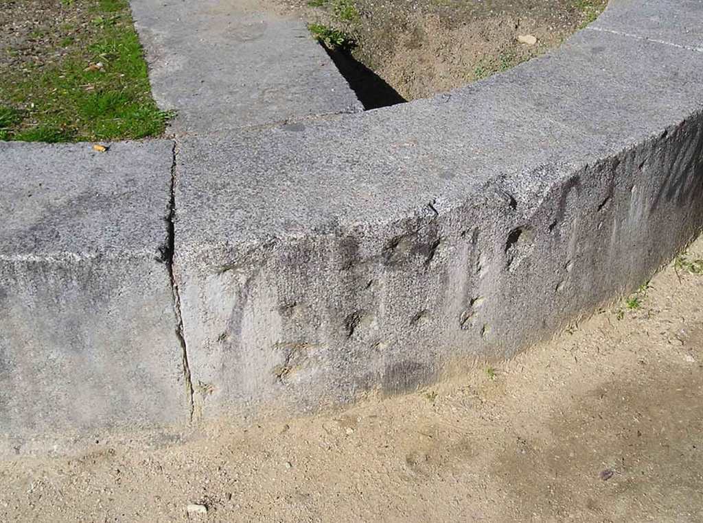 Rodeada de una solera de granito en dos escalones. En sus piedras aún se nota la huella imborrable de los disparos de la última guerra.