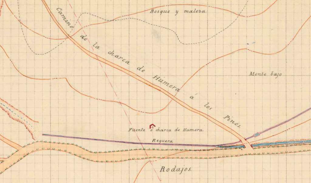 La Charca grande de Húmera: Fuente que reciben sus aguas por medio de minas, situada en el cuartel de la Torrecilla, tiene un trozo de mina vestida desde la embocadura hasta la arqueta de descanso, donde se divide en dos ramales sin vestir: uno en dirección a Rodajos y el otro en la del cuartel de los Pinos.
