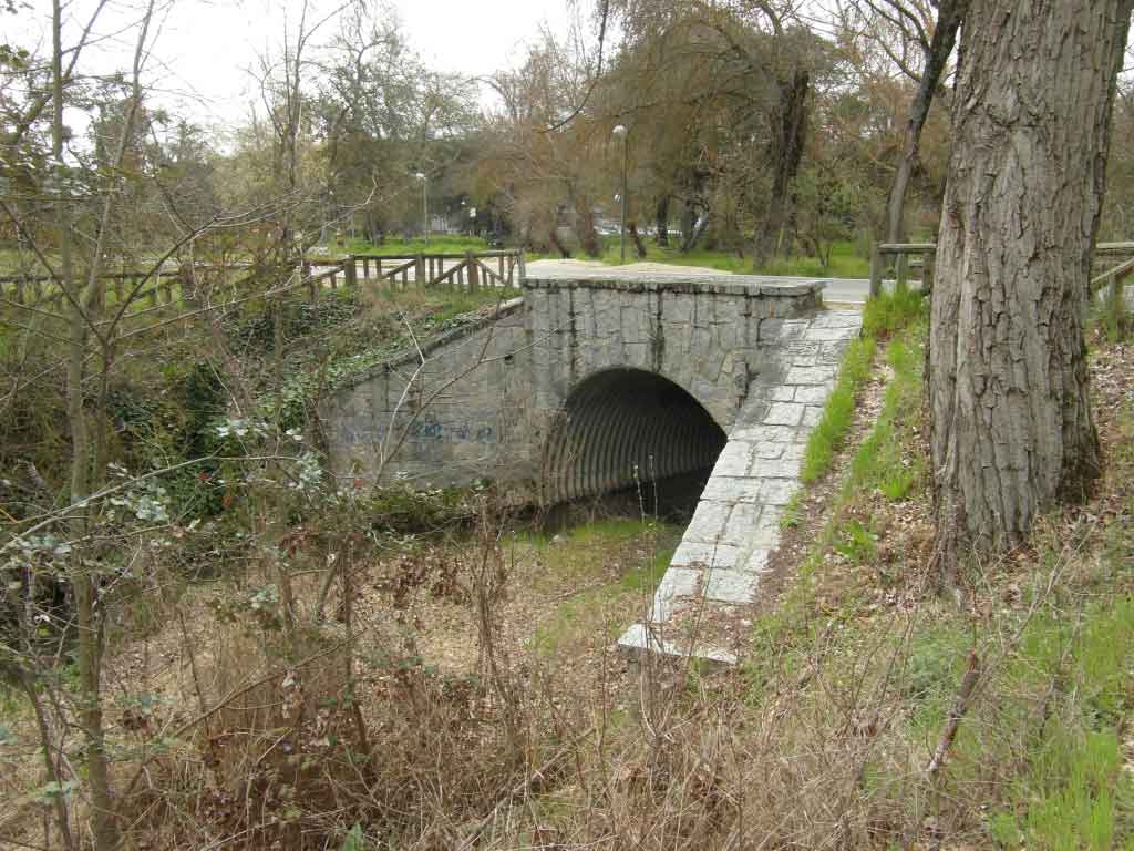 Si analizamos la situación de los Puentes que había sobre el Arroyo de los Meaques vemos que en el año 1845, Pascual Madoz ya nos dice que “hay en dicho Arroyo 6 Puentes construidos de sillería y fábrica de ladrillo y mampostería, llamados de la Culebra, Batán, Álamo Negro, Siete Hermanos, Agachadiza y Neveros”. De estos Puentes en la actualidad solo quedan cuatro, si consideramos el de Neveros que está canalizado y el Puente del Álamo Negro desaparecido en 1970. Cuando Madoz habla del Arroyo de Antequina dice los siguiente: “este Arroyo, por ser más corto y no llevar tantas aguas ni aun en los tiempos lluviosos, cuenta solo un Puente llamado de Antequina construido por el camino viejo de Castilla, y un pontoncillo poco más abajo e inmediato a las expresadas Rejas del Suizo, que da paso al de Medianil”. Vemos que en 1845 aún no se había construido el Puente de la Garrapata ya que esta obra de Enrique Repullés y Segarra no se llevaría a cabo hasta 1888. Sin embargo, ha desaparecido el hermoso Puente de Antequina que servía de paso a la Carretera de Castilla. Y como muchos investigadores de la Casa de Campo, obvia el Puente de las Charcas, en el Arroyo de Vallipuente y el de Cobatillas en el Arroyo del mismo nombre, Puentes los dos construidos por el arquitecto Manuel de Molina en 1748. Falta hablar de un Puente, ya desaparecido, el Puente de la Granjilla sobre el Arroyo del mismo nombre construido en 1862 por el maestro mayor José Segundo de Lema y García. Hay contabilizados más o menos 26 Puentes en la Casa de Campo, muchos de ellos son el mismo y otros se construyeron para el acceso a nuevas instalaciones de la Casa de Campo como Parque de Atracciones y Zoo, cuando se construyó este último se derribó definitivamente el Puente del Álamo Negro y fue sustituido por unas pasarelas de hormigón. En estos Puentes hay que incluir los que se construyeron a partir de 1858 para pasar por encima y debajo de la línea del tren del norte, como; el Puente Alto o el Puente de los Nogales, Puente este último parecido a los cuatro que se construyeron para el paso del tren Suburbano. En 2001 se prescindió del Puente por el que el tren suburbano pasaba bajo el Camino de la Venta al soterrar la nueva estación de Casa de Campo a Campamento.