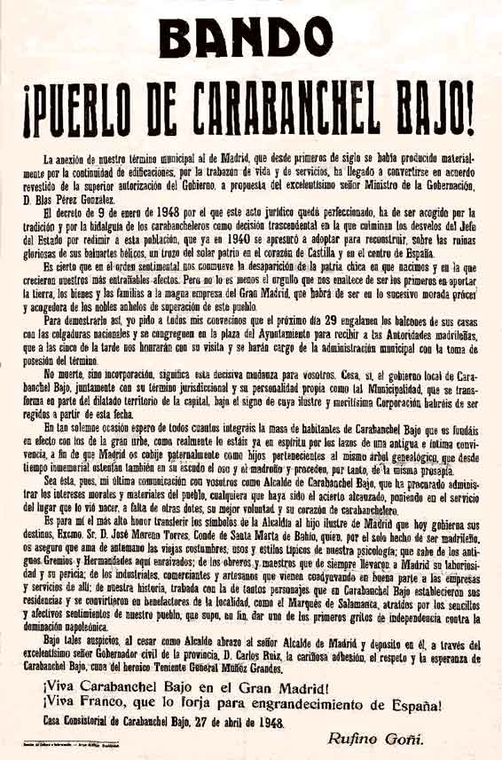 Sucede el 27 de abril de 1948 cuando Rufino Goñi Casemajor, último alcalde de Carabanchel Bajo, anunciaba a sus vecinos a través de este bando del decreto de anexión del Municipio Limítrofe de Carabanchel Bajo a Madrid.