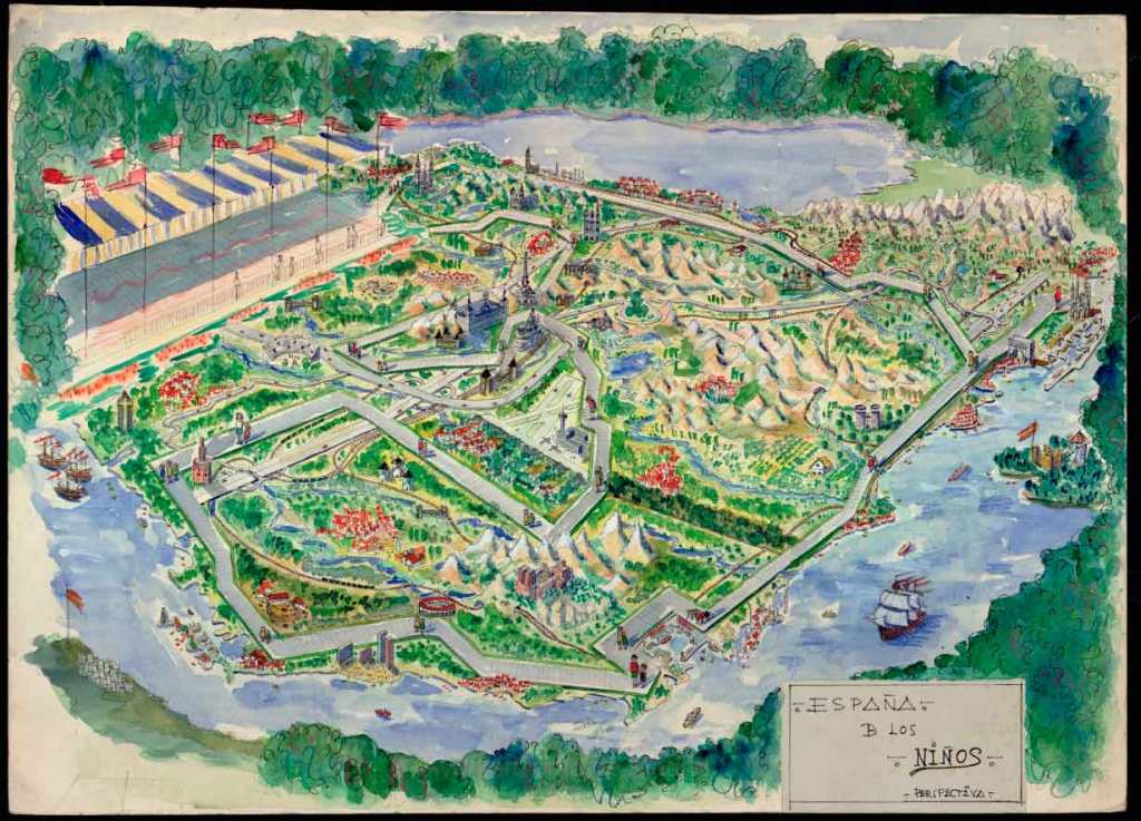 Todo esto se completará con el toque final, «La España de los niños», que será un monumental mapa de España con relieves en los que estarán representados los principales accidentes geográficos, los monumentos de más clase, las más importantes realizaciones de la técnica y la industria; en fin, un auténtico mapa de España viviente y a escala infantil.