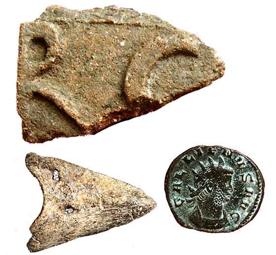 Como en los días anteriores se habían suprimido los árboles que molestaban, la máquina trabaja con rapidez. El terreno, húmedo de anteriores tormentas, se deja excavar y desde el primer momento surgen los hallazgos: una mancha negra determina una zona donde aparecen los primeros indicios de restos romanos; trozos de cerámica tosca y de terra sigillata, tejas, ladrillos y posteriormente un broche o fíbula y una moneda.