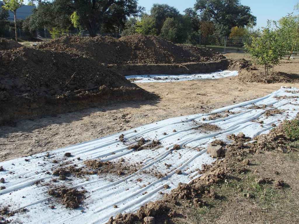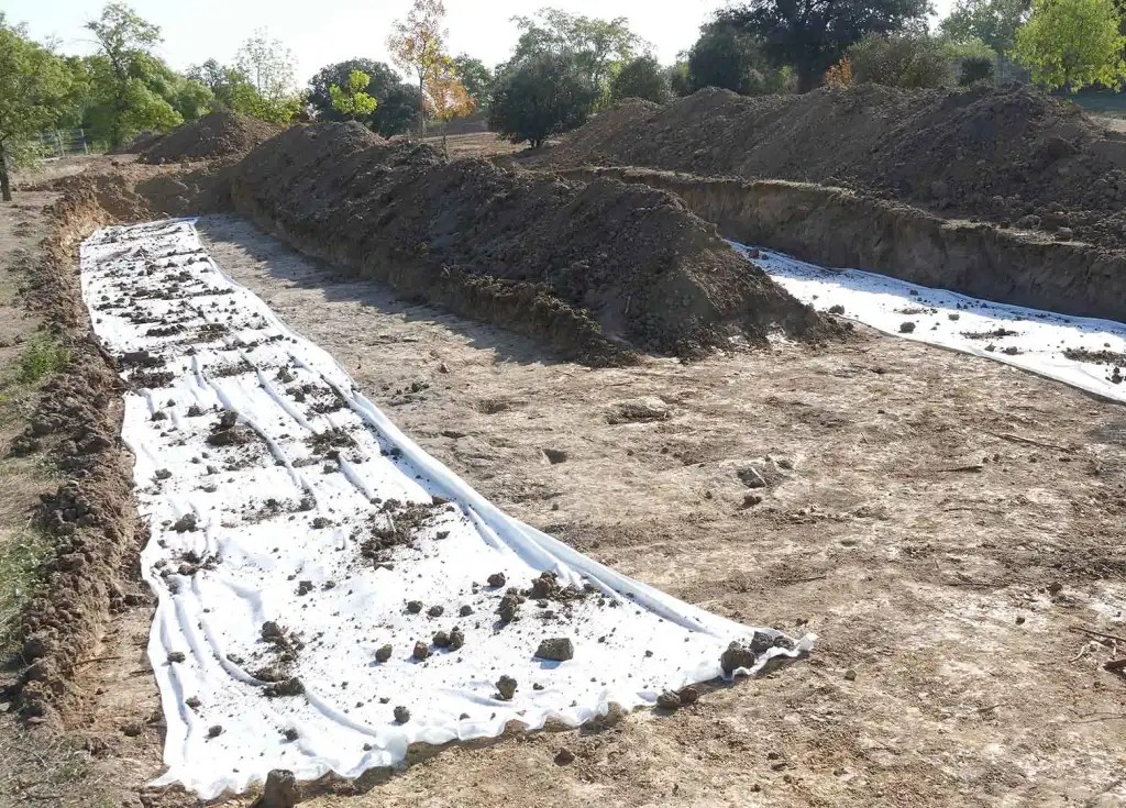 Hoy jueves 17 de octubre de 2019 en una mañana torrencial de lluvia, luego suavizada, se ha comenzado a tapar las zanjas que previamente se habían cubierto con tela para futuras excavaciones.