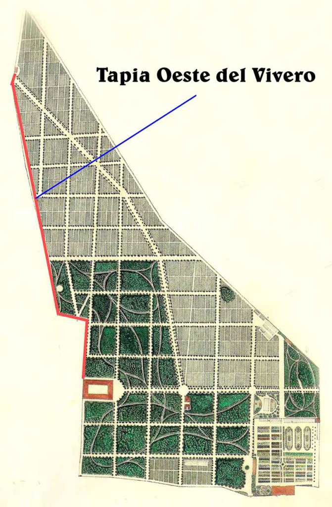 La tapia interior que va desde la Faisanera y su bosque llega hasta la Puerta del Hondo y sube para continuar por el Paseo del Piñonero hasta la Puerta de Enmedio y rematar en la Plaza de las Moreras. Con un total de 655 metros lineales. Es la que cerca la parte oeste del Vivero.