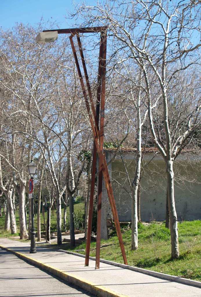 Consisten en dos estructuras triangulares entrecruzadas de gran sencillez, hechas de tubo metálico y una caja cúbica donde se aloja la bombilla. Alcanzan una altura de 7 metros y se apoyan entre puntos sobre unos dados de hormigón enterrados. En 2022 se empezaron a colocar nuevas farolas imitando este diseño, un gran acierto que seguramente se debe al arquitecto José de Coca Leicher.