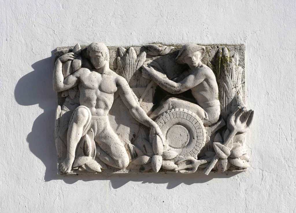 Podemos ver a los lados de la puerta de entrada dos esculturas adosadas a la pared con motivos mitológicos relacionados con la agricultura.