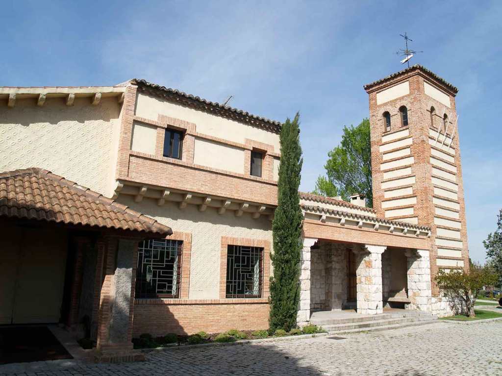 Sobre zócalo de piedra, las fachadas con paños verdugados de ladrillo y enfoscado blanco. La torre con campanario, situada en la esquina visible al final de la cuesta de acceso se inspira en la torre segoviana tradicional. Es un híbrido de iglesia y construcción inspirada en lo popular.