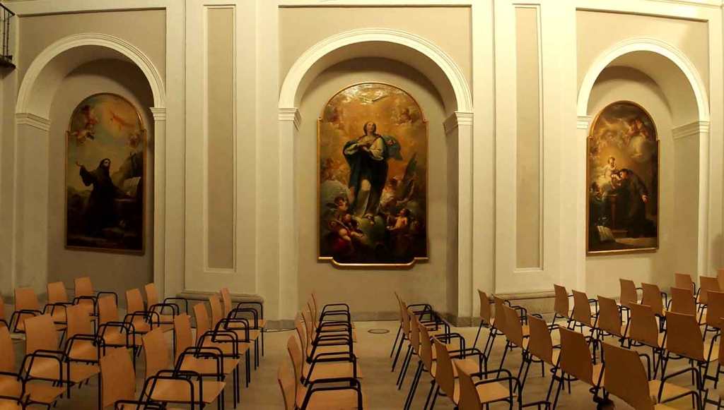 De su interior sabemos que la Iglesia tenía un rico altar mayor de mármoles españoles y dos altares a los lados de menor categoría que estaban dorados. En estos altares destacaban tres cuadros de Mariano Salvador Maella. Estos tres lienzos son los que venían a buscar en ese día. Del altar central desmontaron la Inmaculada y los otros; San Francisco de Asís del altar de la izquierda y San Antonio de Padua del de la derecha. Antes, como dije se había trasladado el material más pequeño a los almacenes del Museo Municipal; como una lámpara de plata repujada que colgaba en el centro de la cúpula. También se llevaron un juego de cruces y candelabros que regaló Carlos IV, una inmaculada de marfil realizada por Andrea Imbros, un armónium y otros objetos de plata como un incensario, un copón y varias conchas de bautizar. Además, en unas cajas de cartón recogieron los libros donde se registraban los nacimientos, bautizos, bodas y defunciones. Durante la semana del 20 al 25 de abril de 1936 todo este material perfectamente catalogado fue trasladado a la calle Fuencarral con la intención de ser exhibido en las salas del museo.