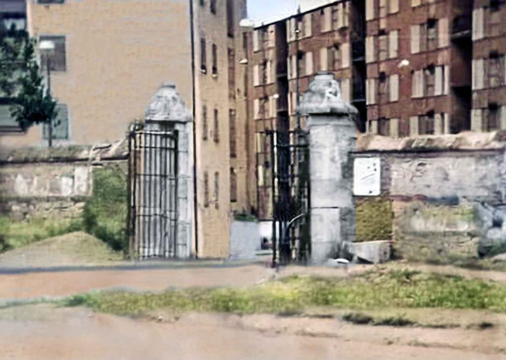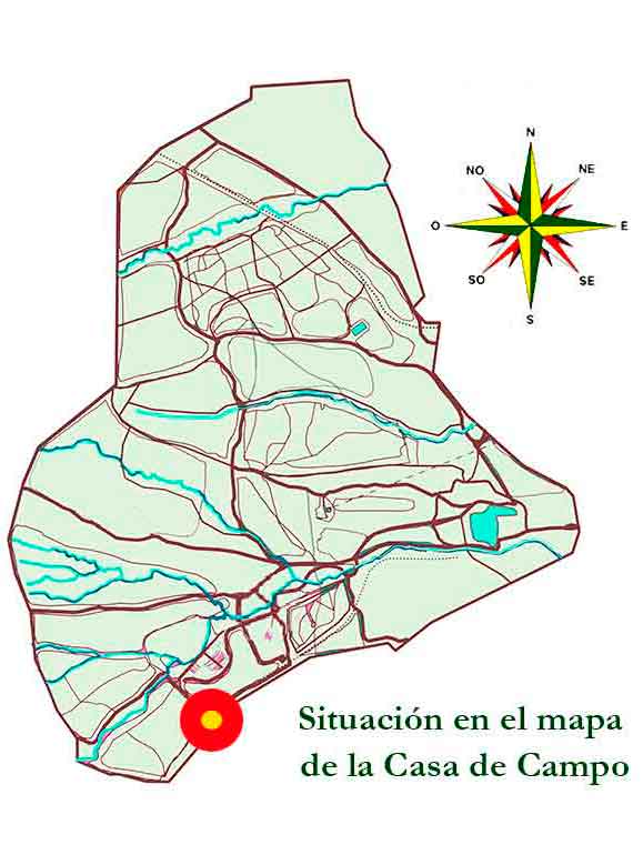 VER SITUACIÓN Google Maps UTM 30T 435453.55 m E – 4472732.27 m N. Estaba en la tapia sur paralela al Paseo de Extremadura en el lugar que hoy está la boca de metro de Casa de Campo, en el Cuartel de Rodajos.