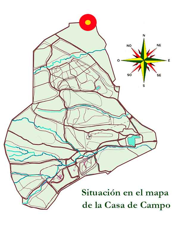 VER SITUACIÓN EN Google Maps UTM 436455.64 m E 4478360.56 m N . En la raya de separación de la Casa de Campo con El Pardo al norte de la Casa de Campo.