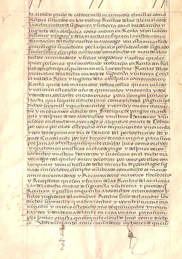 …esta mi carta de privilegio escrita en pergamino y sellada con mi sello de plomo pendiente en filos de seda de colores y libranda de mis contadores mayores y de otros oficiales de mi casa dada en la villa de Madrid a veinte siete días del mes de junio año del nacimiento de nuestro salvador Jesús mil y quinientos y noventa y dos años va escrita sobre…