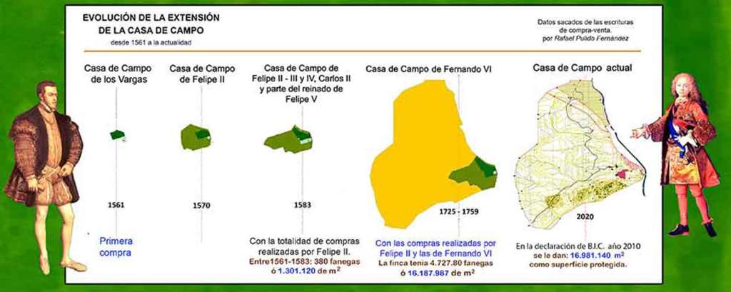 En los años 1556 al 1700 y los reinados de Felipe II, Felipe III, Felipe IV y Carlos II, a la Casa de Campo se le pueden atribuir generosamente 330 fanegas lo que haría una cifra de 1.129,920 m2. Este cálculo lo establecemos a partir de lo que fue la Casa de Campo de Felipe II medido en la actualidad ya que en las primeras escrituras no consta la medida de los terrenos. De las 330 fanegas que se compran, la mayoría se producen durante el reinado de Felipe II, sólo 5 fanegas pertenecen a compras de Carlos II. Ni Felipe III y IV hacen compras.