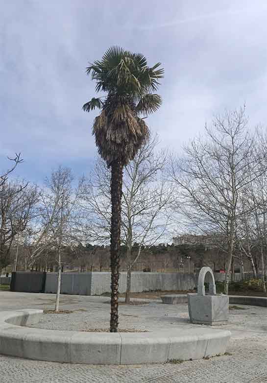 Esta palmera formaba parte de un pequeño jardín paisajista que existía en la entrada del recinto de Plantas Medicinales. Estaba emplazada en una península dentro de una lámina de agua con forma de riñón. Estuvo completamente abandonada y desatendida durante décadas y se salvó milagrosamente de las obras de soterramiento de la M-30 que convirtió la Huerta de la Partida en un enorme cráter. Esta palmera evoca a ese pequeño jardín paisajista del que formó parte y también a las filas de palmeras, de esta misma especie, que adornaban el eje del jardín del Palacio de los Vargas a principios del siglo XX. Sin embargo es difícil imaginar su pasado en medio del moderno jardín actual.