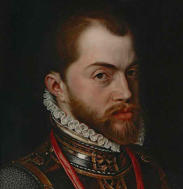 “Yo Don Felipe II por la gracia de Dios Rey de Castilla de León de Aragón de las dos Sicilias de Jerusalén de Portugal de Navarra de Granada de Toledo de Valencia de Galicia de Mallorca de Sevilla de Cerdeña de Córdoba de Córcega de Murcia de Jaén de los Algarves de Algeciras de Gibraltar de las Islas Canarias de las Indias Orientales y Occidentales islas y tierra firme del mar océano archiduque de Austria duque de Borgoña y de Barcelona señor de Vizcaya y de Molina etc.”