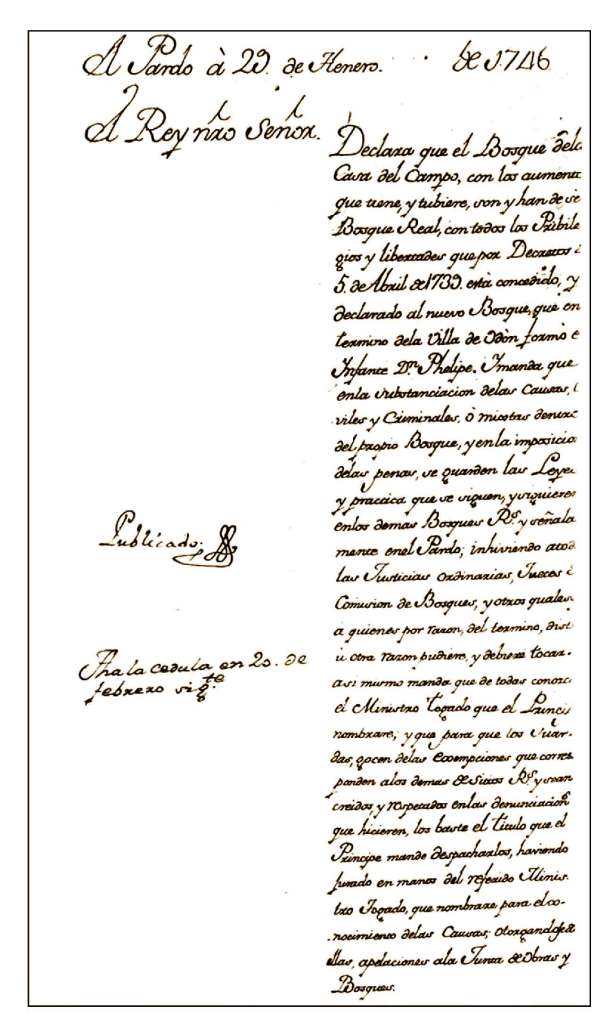 “por que aviendo comprado el señor Rey Felipe II la Casa del Campo, y tierras de su heredamiento, las incorporó, y agregó al Bosque del Pardo, por la Cédula 54 de doce de Mayo de 1567, sugetándolas al Alcalde Juez de Bosques, para que juzgase sus causas, por las leyes y Ordenanzas hechas para el Pardo”.