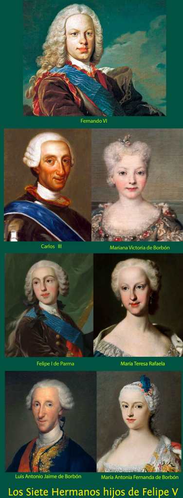 Estos eran los hermanos que en 1746 tenía Fernando VI, todos ellos eran hijos de Felipe V ya solo quedaba Fernando de los cuatro hijos que tuvo María Luisa Gabriela de Saboya con Felipe V.