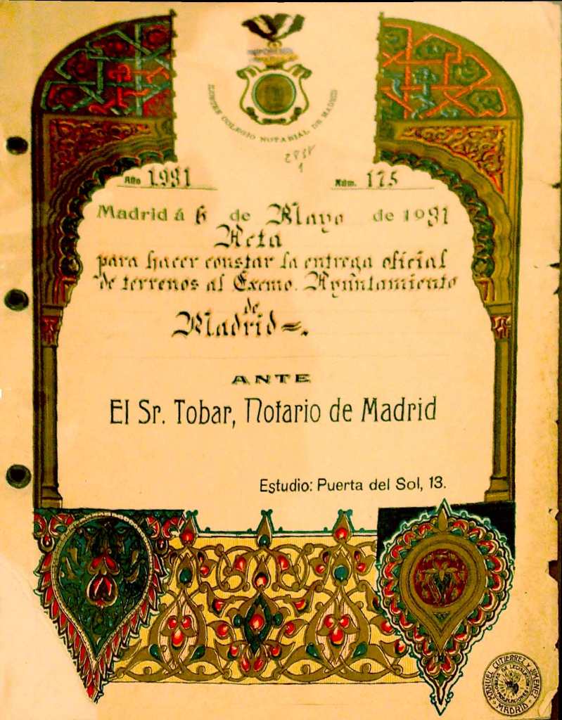 «ACTA para hacer constar la entrega oficial de terrenos al ex­celentísimo Ayuntamiento de Madrid. Número ciento setenta y cinco. En Madrid, a seis de mayo de mil novecientos treinta y uno. Yo, Pedro Tobar, Notario por oposición y Abogado de los Ilustres Colegios de Madrid, Doctor en Derecho, Ciencias sociales y Filosofía y Letras, con vecindad y residencia en esta Capital, Puerta del Sol, número 13, por cesión de turno que me ha hecho mi señor padre y compañero D. Francisco Tobar y Vitón, a quien había correspondido, hago constar: PRIMERO: Que por virtud de la aludida cesión de turno me corresponde presenciar y dar fe del acto de entrega oficial por la representación del Estado al Excmo. Ayuntamiento de Madrid de los terrenos de la Casa de Campo y parque Campo del Moro, com­prendidos dentro de las tapias de estas posesiones y que fueron parte del Patrimonio que fue de la Corona y cuya cesión al citado Ayunta­miento fue decretada por el Gobierno provisional de la República, a propuesta del Excmo. Sr. Ministro de Hacienda, en veinte de abril último, habiéndose publicado el correspondiente decreto en la Gaceta de Madrid del día veintidós inmediato siguiente. SEGUNDO: Que habiéndose señalado para el citado acto el día de hoy y por hora de las doce, me he constituido con la antelación oportuna en la plazoleta que da frente a la fachada principal de la Casa administración de la Casa de Campo, y siendo la hora señalada, el Excmo. Sr. Ministro de Hacienda, D. Indalecio Prieto y Tuero, en representación del Estado, ha manifestado que sin perjuicio de que en su día se otorgue la es­critura procedente, hacía entrega oficial al Excmo. Ayuntamiento de Madrid, representado por el Presidente del mismo, el Excmo. señor Alcalde D. Pedro Rico y López, de los terrenos de la Casa de Campo y de los del parque Campo del Moro, comprendidos dentro de las ta­pias de dichas posesiones, de acuerdo y con las condiciones que se consignaron en el referido Decreto de cesión de veinte de Abril últi­mo, que será a tiempo reproducido en su totalidad, haciendo constar que como aclaración de lo preceptuado en el párrafo tercero del ar­tículo primero del mismo Decreto, el Ayuntamiento de Madrid debe­rá ponerse de acuerdo con el Ministerio de Hacienda para todas las modificaciones que quiera realizar en los bienes cedidos, acuerdo que será necesario también para las variaciones que pudieran proyectarse con relación a las cortas o podas extraordinarias de arbolado y a la estructura de paseos y jardines, por ser aquéllos una de las pocas muestras que quedan de la Jardinería clásica española que conviene conservar, y por la necesidad consiguiente de proceder con la mayor cautela en las alteraciones que hayan de realizarse. Asimismo se hace constar que dentro de las tapias de la posesión llamada Casa de Campo existe enclavada una finca particular denominada Pozos de la Nieve que se encuentra amojonada y que no perteneciendo al que fue Patrimonio de la Corona, no está comprendida en la cesión que por esta acta se formaliza. TERCERO: El Excmo. Sr. Alcalde Presi­dente del Ayuntamiento de Madrid, en representación del mismo, ha manifestado que recibe también oficialmente los expresados terrenos y parque para destinarlos a parques de recreo e instrucción con todas las condiciones que figuran en el referido Decreto de cesión y las que como aclaración se han consignado en esta acta, al cumplimiento de todas las cuales obliga al Ayuntamiento por él representado. De todo lo cual, yo, el Notario, levanto la presente acta, extendida en este pliego y en el que le antecede de la misma clase y serie número ante­rior, que leo íntegramente a los Excmos. Sres. Ministro de Hacienda y Alcalde del Excmo. Ayuntamiento de Madrid, a quienes conozco, después de advertidos del derecho que tienen de leerla por sí, a que renuncian, firmándola por encontrarla conforme conmigo, que a más la signo y rubrico y doy fe de todo su contenido. Indalecio Prieto y Tuero. Pedro Rico. Testigo: Antonio Vallejo. Testigo: Alfredo Zabala. Testigo: Miguel de Cámara. Testigo: Fabián Talanquer. Tes­tigo: Mariano Berdejo. Testigo: Enrique Ruiz de la Serna. Testigo: V. Casanueva. Testigo: Francisco Romero. Testigo: Luis R. Marín. Testigo: Gabriel Subias Testigo: Félix Ortega. Rubricados. Signado: Pedro Tobar. Rubricado. Doy fe de que esta acta es copia de su matriz señalada con el número al principio indicado en mi protocolo general corriente de instrumentos públicos.