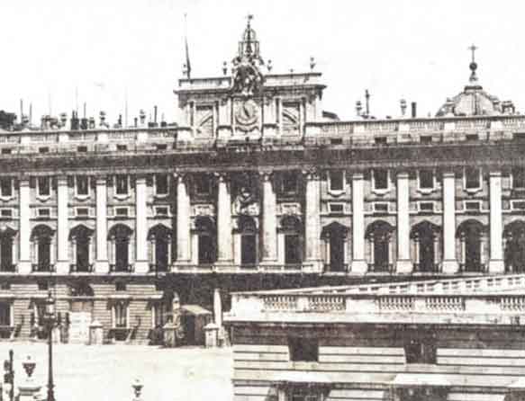 En el proyecto original las cornisa de este gran edificio iba a estar decorada por 108 esculturas de gran tamaño, representando a los monarcas de los diferentes reinos relacionados con la monarquía española: América, Portugal, Castilla, Aragón, Galicia, Navarra y a los distintos Reyes de España