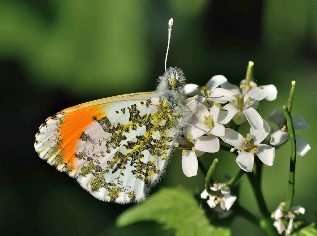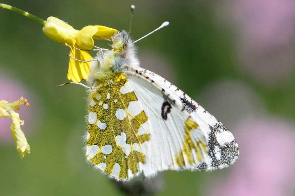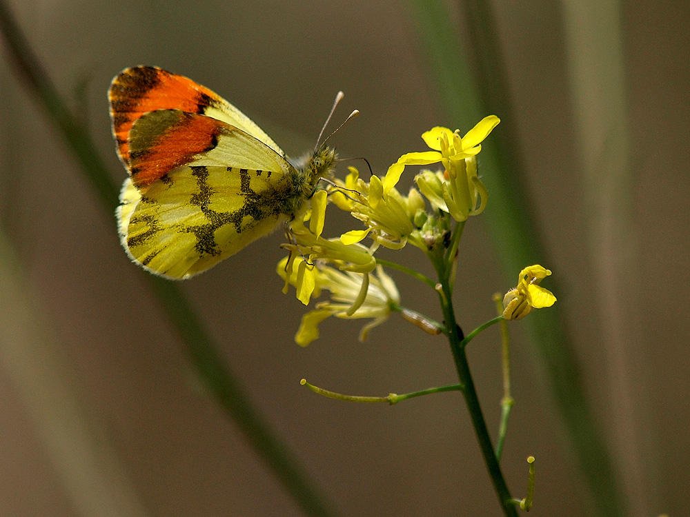 Planta nutricia: crucíferas como Alliaria petiolata (aliaría). Arabis glabra, A. hirsuta, Barbarea vulgaris, (hierba de Sta. Bárbara), Biscutella laevigata (hierba de los anteojos), Brassica napus (nabo), Cardamine amara (mastuerzo de prado), C. pratensis (berro de prado), Sinapis arvensis (mostaza), Sisymbrium irio (matacandil, jaramago amarillo), S. officinale (erísimo, hierba de los cantores) y resedáceas.