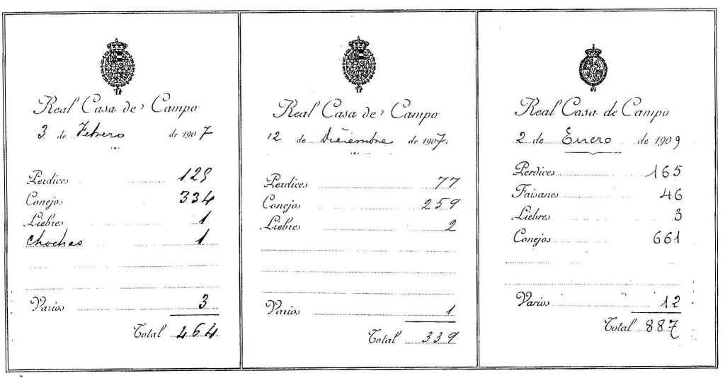 Muchas de las piezas de caza menor fueron conseguidas por Alfonso XIII en la Casa de Campo donde eran muy abundantes, sobre todo los conejos. En 1909 se cazaron en ese lugar no solo por el rey, sino por otros miembros de su familia, personas con licencia, etc. más de 56.000 conejos y como causaban tantos destrozos se decidió sustituirlos por perdices y faisanes.