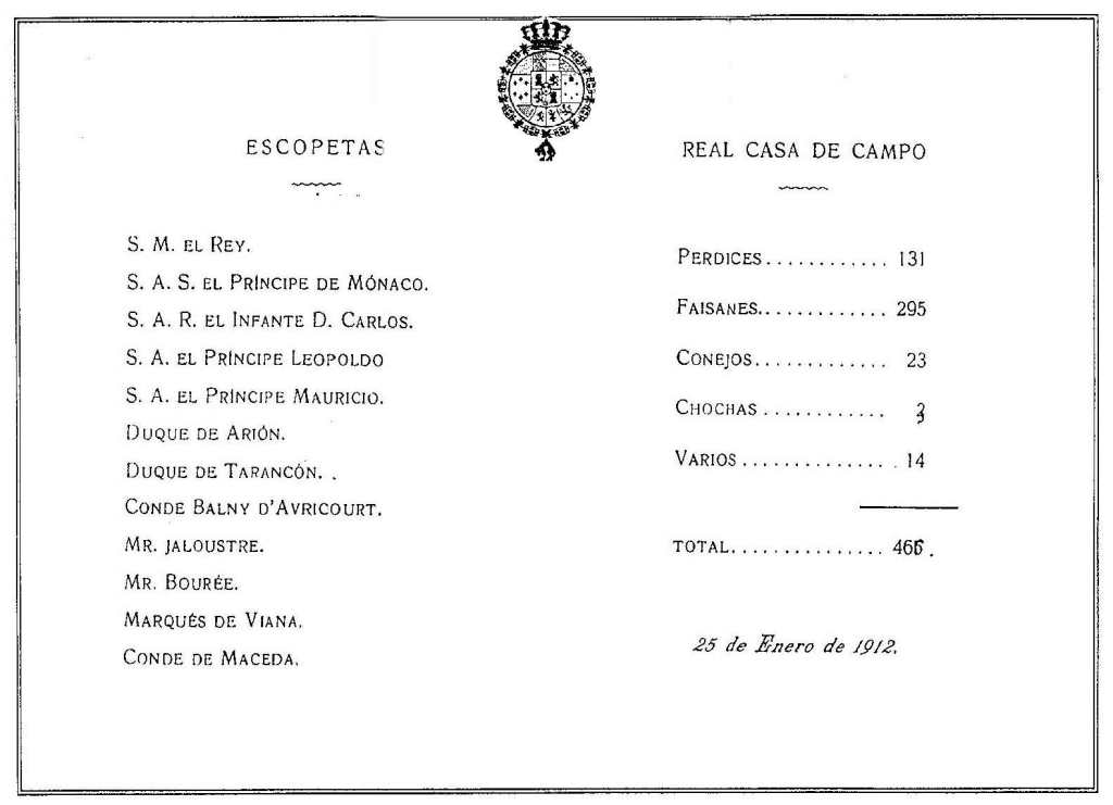 Pero es con la llegada de Alfonso XIII cuando se establece la tradición de cazar como un agasajo a los aristócratas y altos dignatarios que venían a Madrid. La caza que en ese momento se podía cobrar era menor y por las anotaciones que tenemos de esas cacerías sabemos que se cazaba: Faisanes, perdices, conejos, liebres, chochas y en el concepto de varios; podía entrar cualquier ave que estuviera en el lugar.
