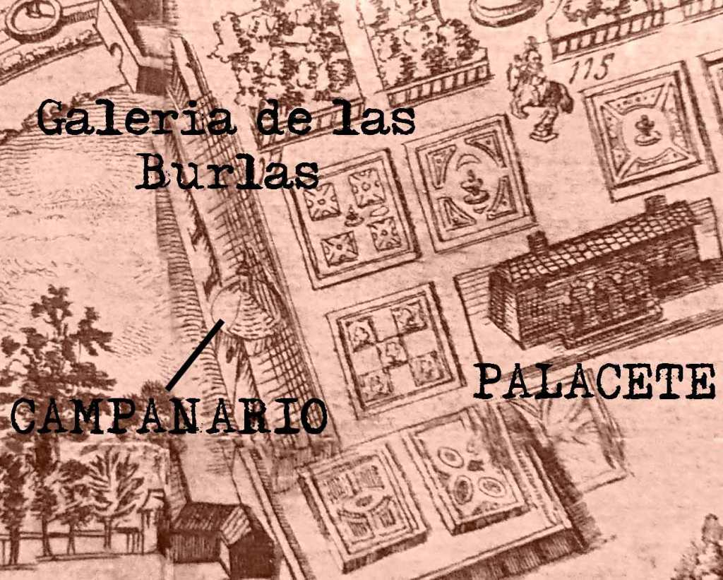 Hay que recordar que el Campanario tal como lo conocemos ahora es construido por el Arquitecto Mayor de Palacio José Segundo de Lema en 1876 y lo hace sobre la pared del anterior que se apoyaba en la Sala del Mosaico de la Galería de las Burlas.