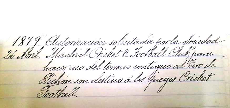 El 26 de abril de 1879 la sociedad «Madrid Cricket y FootBall Club» solicita el uso de un terreno contiguo a Tiro de Pichón de la Casa de Campo con destino a jugar football. Archivo General de Palacio