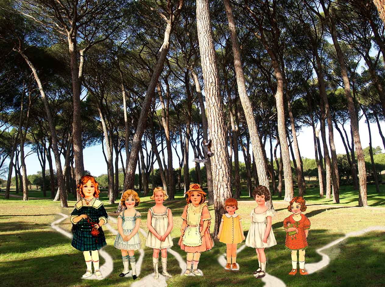 Pero las mariposas no se dejaban atrapar y volaron, atrayendo a las niñas hacia un sombrío bosque de imponentes pinos.